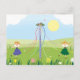 Two girls dancing around the Maypole with flowers, sun, and clouds.