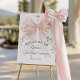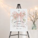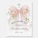 A beautiful feminine Girl's First Holy Communion Welcome Foam Board Poster easel sign with a pastel pink watercolor bow embellished with pink flowers. A lovely silver cross sits above the bow as a symbol of Christianity. The attractive text template arranges your text in classic style. Easy to personalize and prepare for this special occasion in the life of your daughter.