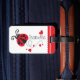 Cute id kids luggage label featuring a flying ladybug / ladybird with hearts in red, black and white. Personalize with your name on both the front and reverse. Currently reads Isabella. Uniquely designed by Sarah Trett.