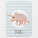 This cute and modern baby blanket features a pink triceratops dinosaur cartoon with blue stripes and can be personalized with your girl's name. Perfect for your dinosaur loving child’s room or baby nursery. Check out our store for other cute gender neutral dinosaur items.
