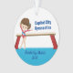 This cute gymnastics girl Christmas ornament features a pretty brunette gymnast girl standing in front of a beam. She is wearing a red leotard and smiling to next above her name in blue cursive script. Perfect holiday present for a child who loves gymnastics.