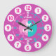 Colorful girls graphic wall clock color coded to help assist your child to read a clock. This colorful teaching aid includes minutes and hours and past and to making child's play of telling the time. Clock color coded in pinks, aqua and white featuring a little white butterfly and can be customized with your name of choice. Currently reads Kylie. Designed exclusively by Sarah Trett. A great addition to a little girl's bedroom who is just learning to read a clock face.