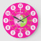 Colorful girls graphic wall clock color coded to help assist your child to read a clock. This colorful teaching aid includes minutes and hours and past and to making child's play of telling the time. Clock color coded in pinks, bright green and white featuring a little daisy type flower. Clock can be personalized with your own choice of name. Currently reads Rachel. Designed exclusively by Sarah Trett. A great addition to a little girl's bedroom who is just learning to read a clock face.