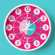 Colorful girls graphic wall clock color coded to help assist your child to read a clock. This colorful teaching aid includes minutes and hours and past and to making child's play of telling the time. Clock color coded in red, pink, aqua and white featuring a little white butterfly and can be customized with your name of choice. Currently reads Juliette. Designed exclusively by Sarah Trett. A great addition to a little girl's bedroom who is just learning to read a clock face.