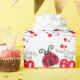 Birthday wrapping paper in a white, red and black girls flying ladybug / ladybird and hearts design. Personalize this girlie birthday paper with your own name and double figure age. Currently reads Happy Birthday Beth 60 today. Perfect for wrapping a special 60th birthday gift. Uniquely designed by Sarah Trett for www.mylittleeden.com