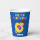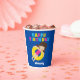 Awesome kids swimming pool party Happy Birthday paper cup for a brunette child on the swim team during the summer. Features a bright, fun pop of colors and an adorable swimming girl in an inner tube. Customize for special children's decor.