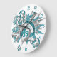 This cool girl's volleyball wall clock features an "explosion" of varied size teal, gray and white volleyballs and teal, gray and white star shapes with overlying clock face numerals - the teal and gray volleyball panels are blended with a girly, floral kaleidoscopic pattern - customize with athlete's name and jersey number - by katz_d_zynes