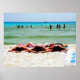 A summer photograph of three girls sunbathing on the beach as holiday makers take a dip in the water, beautiful blue sea with a boat in the distance
