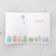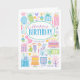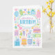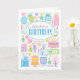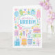 A bright pastel girly card for 21st birthday full of every thing birthday and party related for her. Cakes, presents, balloon, flowers, and party hats fill the card and also form the bottom border on the inside of the card.
