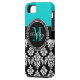 Girly Aqua Black Damask Your Monogram Name Case-Mate iPhone Case