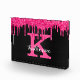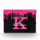 This trendy and unique glam girly design features hot pink fuchsia magenta glitter drips at the top and a large customizable monogram in bright pink in the center in popular serif typography along with a customizable name in white in popular script with a hand-lettered look. The background includes brushed charcoal gray black onyx metal for added sparkle, a perfect way to brighten up your shelf, desk, or tabletop. You can personalize this item by changing the monogram and name in the product template.