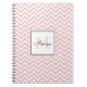 Personalized spiral notebook features a beautiful girly blush pink chevron pattern with custom name in black handwriting font and monogram in pastel red shade in white square frame.