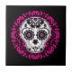My version of a super cute sugar skull in white, hot pink, and black with lots of elegant accents on a coordinating background. Shown here on a decorative tile.