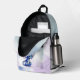 Pretty girl's fantasy printed backpack done in violet, blue and white. Adorable graphics of a blue baby dragon adorns the front of the pack along with a large blue single letter monogram and custom violet name. Great gift idea for her.