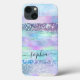 This stylish and glam phone case features abstract stripes of faux glitter, sparkly holographic looks in turquoise blue, pink, and purple. Add your name in trendy handwritten script.