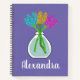 Add your name to this gorgeous sketchbook to make it your own. Three flowers in blue, gold, and pink with a glitter effect in a vase with water are featured in the design.