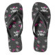 A very cute pair of black flip flops with an edgy pattern of girly skulls with pink bows, and pink cherries scattered through them.