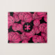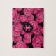 This pink and black girls' basketball jigsaw puzzle features a pattern of varied size hot pink basketballs on a black background - customize with basketball player's name and monogram - by katz_d_zynes