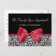 A trendy black and white leopard print hair and beauty salon appointment reminder postcard with a girly red ribbon tied into a cute bow. Personalize this stylish animal print design by adding the name of hairstylist or beautician. Flat printed image, not actual bow.