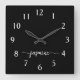 Girly Simple Minimalist Black Monogram Name Script Custom Personalized Square Wall Clock. These design featuring your first name in a pretty hand lettered style swash tail font signature typography white script on black color background. These are easy to customize it. Great stylish feminine housewarming gift, also for birthday, wedding, bridal shower, mother’s day, sweet 16 birthday party and baby shower, graduation and It’s for the girl who loves unique sparkle stylish things.