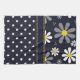 A towel with a girly retro mod flower pattern on the top with white daisies with yellow centers against a navy blue background, and a trendy blue and white polka dot pattern on the bottom.