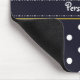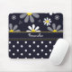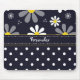 A mousepad with a girly retro mod flower pattern on the top with white daisies with yellow centers against a navy blue background, and a trendy blue and white polka dot pattern on the bottom. Personalize by adding your name. Perfect present for a stylish girly girl.