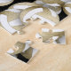 This fun girls' volleyball jigsaw puzzle features a pattern of varied size muted gold, bronze and white volleyballs turned every which way on a black background - the non-white panels are colored with a light to dark bronze gradient accented with an artsy, girly, floral pattern - customize with volleyball player's name and jersey number - by katz_d_zynes