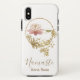 Case-Mate Tough Apple iPhone XS Case - Beautiful Pink Lavender Lotus and Lily Pad with Gold Glitter Edges is inside a Gold Glitter Circle loaded with Gold Foil and Gold Glitter Hand Painted Brush Splatters and Brush Strokes. This pretty design is on a white background.