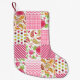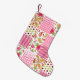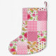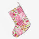 A Christmas stocking featuring a patchwork inspired design which incorporates floral, stripes, polka dot, paisley, chevron, and gingham patterns with a girly pink color scheme.