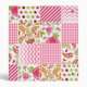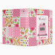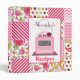 A binder featuring a patchwork design which includes polka dots, zigzags, paisley, roses, gingham, and stripes. Front features an illustration of a retro pink stove. Personalize with your name above stove.