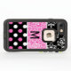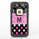 Girly black LifeProof FRĒ® iPhone 7 case with a black and white damask pattern, on top, a pink and white floral pattern, in the middle, and a white and pink on black polka dot pattern, across the bottom. Personalize the black one letter monogram, to suit your needs. Chose case style and type you want before ordering.