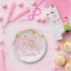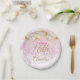 A gorgeous blush pink and glitter balloon happy 16th birthday party plate. This feminine design is the perfect way to help someone celebrate a happy 16th birthday (or any age!) Personalize with our own custom name. Pink and gold colored typography on a bubble effect girly background.