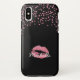 Trendy girl iphone case featuring a black background, pink glitter confetti, lush pink lipstick print, and your name.