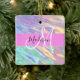 Girly pink, peach and aqua holographic iridescent monogram name and initial ceramic ornament. Your custom name and monogram are written in an elegant hand lettered script with a pink background. A perfect birthday or Christmas gift!