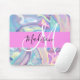 Girly pink, aqua and turquoise holographic iridescent monogram name and initial mouse pad. Your custom name and monogram are written in an elegant hand lettered script with a pink background. A perfect birthday or Christmas gift!