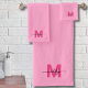 Personalized Girly Pink Modern Script Name Monogram Bath Towel Set. Add a cheerful and girly vibe to your bathroom with this stylish towel set, perfect for anyone who loves fun and feminine designs. Featuring a bright happy pink background, each towel in the set—a bath towel, hand towel, and washcloth—displays a bold magenta hot pink initial paired with a sleek black script name monogram in the bottom right corner. This vibrant and playful set makes a fabulous gift for sorority sisters, a perfect addition to a sorority house, or a thoughtful present for bridesmaids. It's also a great choice for a college student decorating a dorm room or a sweet keepsake for your child moving out for the first time. Whether for everyday use or as a charming accessory, this monogrammed towel set brings personality and flair to any space.