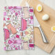 Fun girly pink patterned kitchen towel for girls who love the health spa or beauticians. Printed with a cartoon pattern of girly bathing and beauty items such as bathrobes, soap, bathtubs and bubbles.