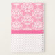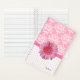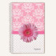 Pretty spiral notebook with a pink and white damask pattern on the upper two thirds of the cover, and a pink and white polka dot pattern, on the bottom. Graphics of a pink ribbon runs across, between the two backgrounds and is decorated with a graphic enhanced photo of a pink Gerber daisy. Personalize the text, for yourself or as a great gift idea.