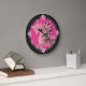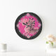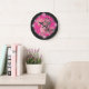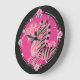 Cute, Girly Pink Zebras by artist Angela Flemming, painted in Fashion Pink and Black Colours. A circular design; the outer border is black, embellished on the inner edge with pink pearls, with four roses--one on top, one on bottom, one on left and one on right . The main part of the painting has a hot pink background, with a pair of prancing zebras of different shades of pink. The zebra in front is of a slightly deeper shade of pink, with black stripes; the one behind is a paler pink, with warm bright pink stripes. The zebras are very cute, with friendly smiles, but also very artistic. This is a cute, girly and elegant wall clock that is suitable for little girls, tweens, teens and ladies!