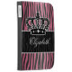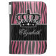 A girly zebra striped pattern in pink and black with a crown. Shown on a Caseable kindle Folio Case