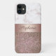 This girly glitter phone case will have your phone protected in style. This trendy design features textures of rose gold and white marble, rose gold faux metallic texture and faux rose gold glitter. Atop the rose gold metallic center is a name in script typography in dark rose gold to personalize. Makes a unique girly gift for any special occasion. Designed by artist ©Susan Coffey.