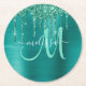 Girly Teal Dripping Glitter Brushed Metal Monogram Round Paper Coaster