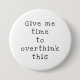 Simple button with black lettering on a white background with the phrase, "Give me time to overthink this."