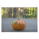 Calming autumn natured themed Thanksgiving. Give Thanks is written in black text.. Small orange pumpkin with high stalk decorated with a festive turkey in the center, green and brown leaves, and pumpkin sticker appliques sitting on a brown wooden deck with black rails and trees blurred in the background. Original Photography Design by TamiraZDesigns.
