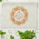 Kitchen towel that reads, “Give Thanks with a Grateful Heart” in a handwritten font, surrounded by a autumn leave and pumpkin wreath. Towel background has a subtle leaf and acorn pattern.