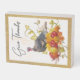 Decorate your home with this wooden box sign. This wood box features a Thanksgiving turkey and harvest pumpkins. There is a gold glitter border that makes this decor box look festive.