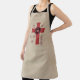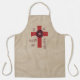 Great color and even though I ordered the kid size, it covers well enough to use during the holidays. I am not a big woman and prefer a shorter apron. I stand 5"6" and the length of the garment goes to mid-thigh. The tie straps fit well at my waist and even though there is no neck strap adjustment, the opening is plenty big enough. I am happy with the size and fit. I am sharing my apron with my 10 year old grandson, too! The color is vibrant and looks good, as shown on the website. The stitching looks strong and reinforced. Photographed is front side and back side of the apron, reinforced straps and coloring. My phone camera may not be the best at showing the details.