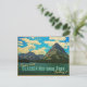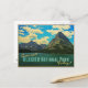 A beautiful blue sky sets of the mountains of Glacier National Park in this fun vintage-look travel design.