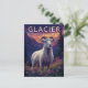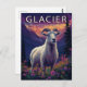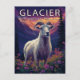 Discover the beauty of Glacier National Park with this stunning postcard. Featuring a majestic white mountain goat in the foreground, towering purple mountains, and vibrant spring flowers, this flat illustration style postcard is perfect for any nature lover.
