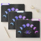 This beautiful, unique, glam boho design features phases of the lunar cycle, including crescent, half and full moons, in pastel teal, blue, purple and magenta pink, arranged in an eye-catching arc against a background of classy charcoal gray black brushed metal foil. Below the moon phases are a customizable lavender monogram and a personalized name in elegant, trendy white script typography for a cool hand-lettered look. Each of the file folders in this set has a different matching interior color: the lavender in the monogram, aqua blue, and pink. You can personalize this item by changing the monogram, name and text in the product template.